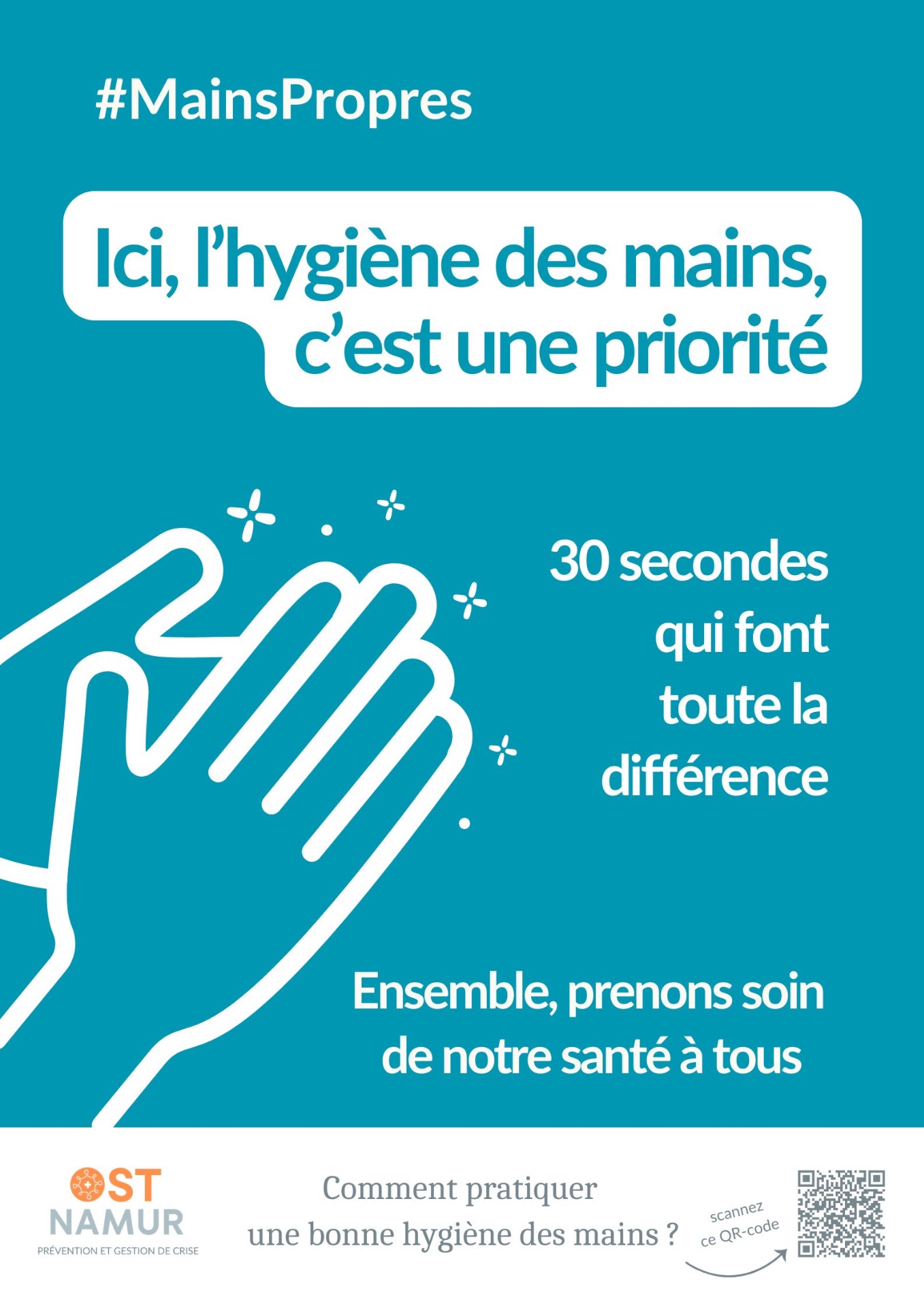 Une grande affiche A2 rappelant l'importance des mains propres et renvoyant vers une vidéo explicative montrant comment pratiquer une bonne hygiène des mains, est disponible sur simple demande.